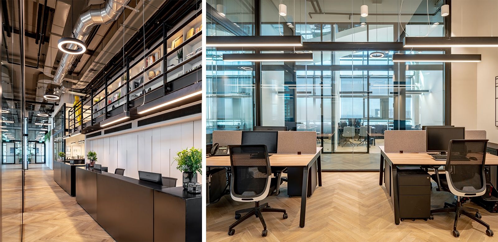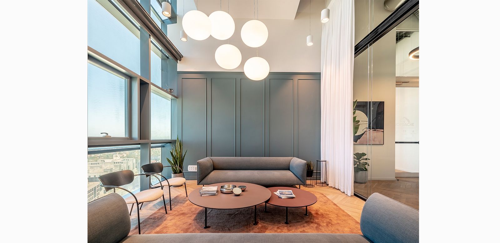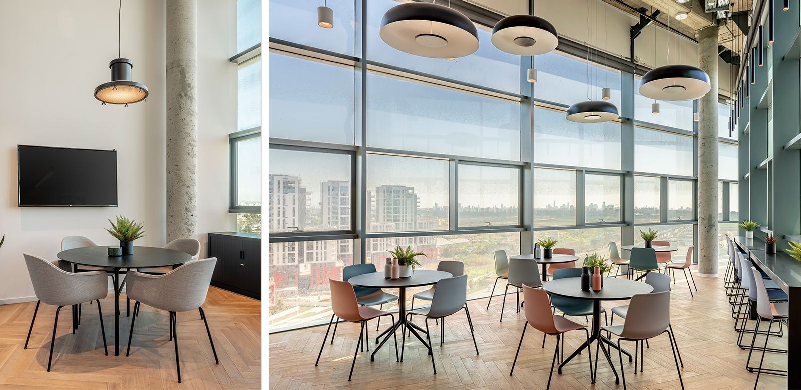 שילוב בין חלל תעשייתי ותקרות גבוהות (כ-6 מטר גובה), לבין עיצוב נקי וקלאסי.