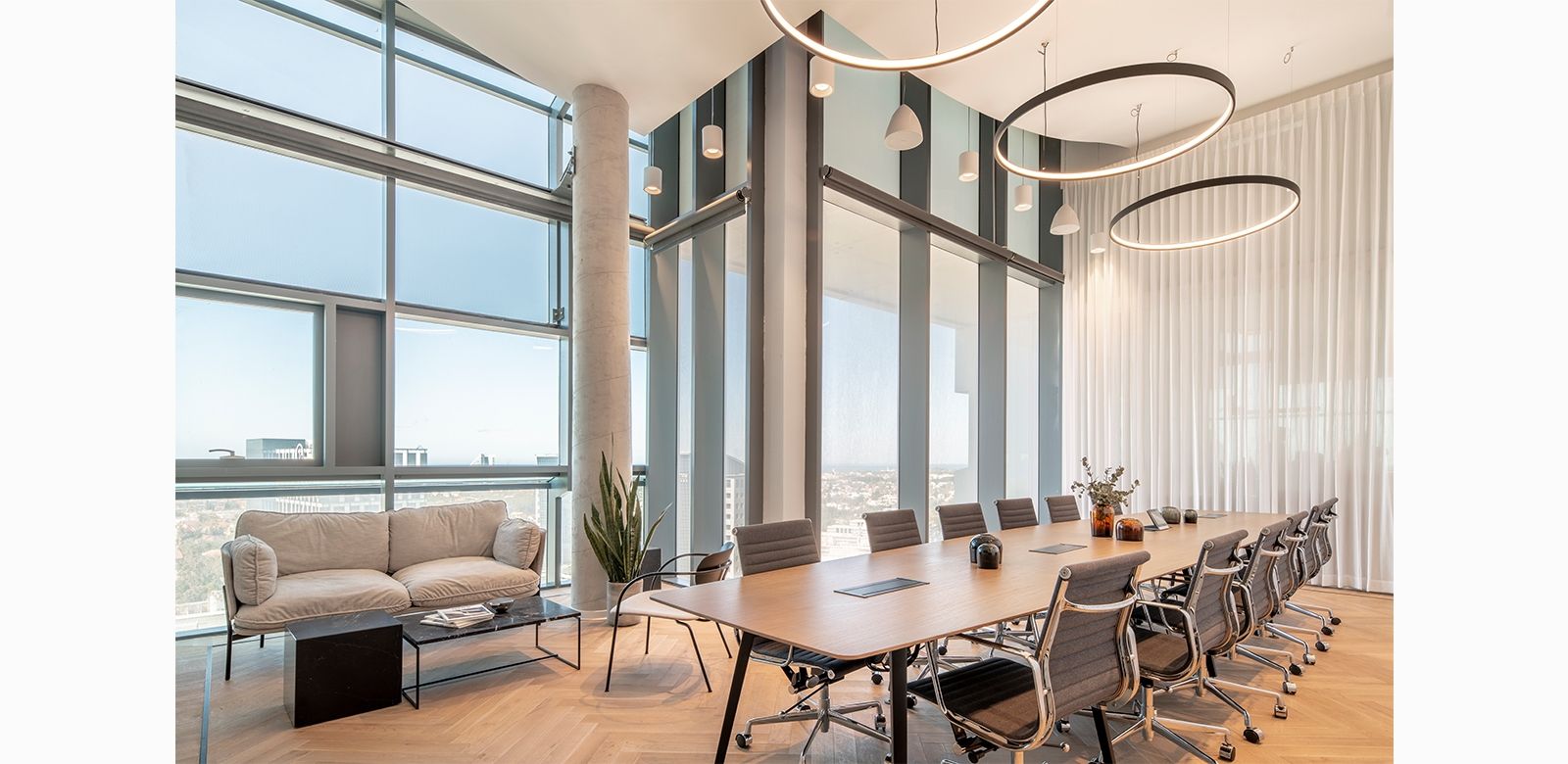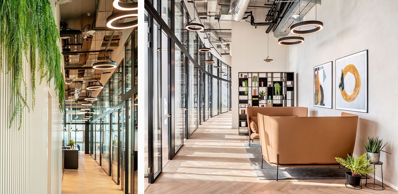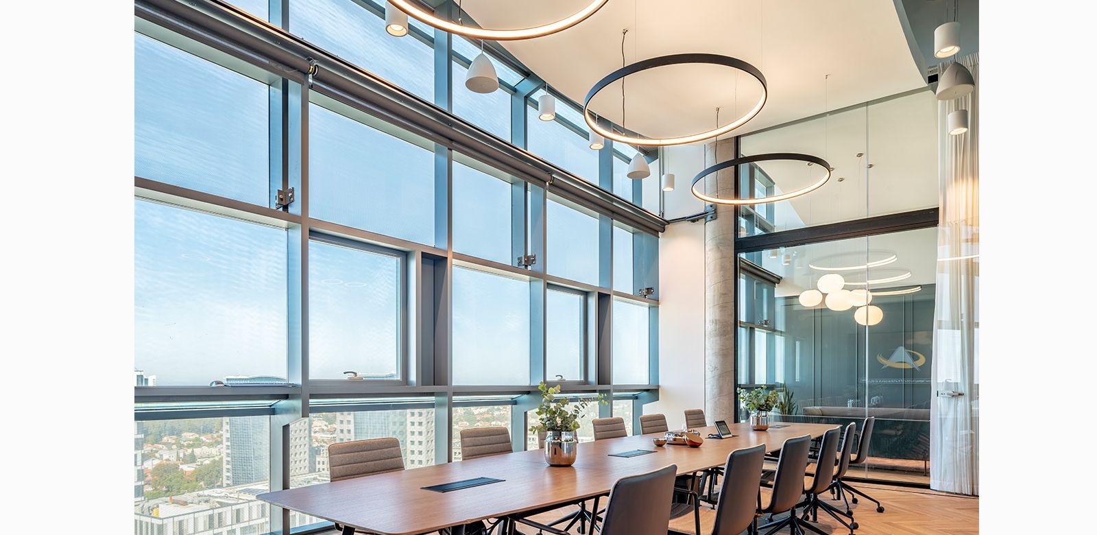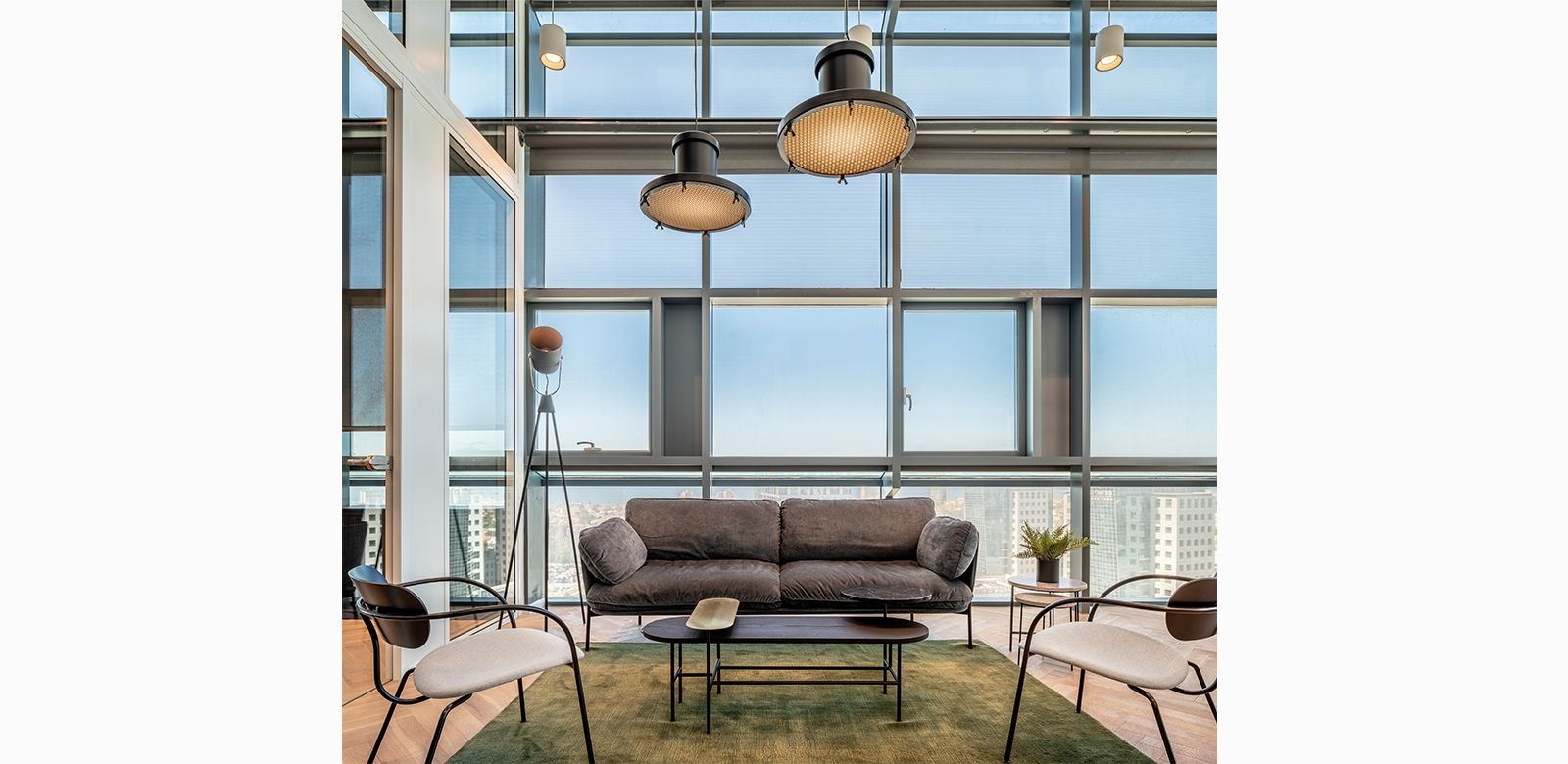 ואילו במשרדים האישיים ובחדרי הישיבות גופי התאורה היקפיים ומאופיינים בעדינות מהודקת,