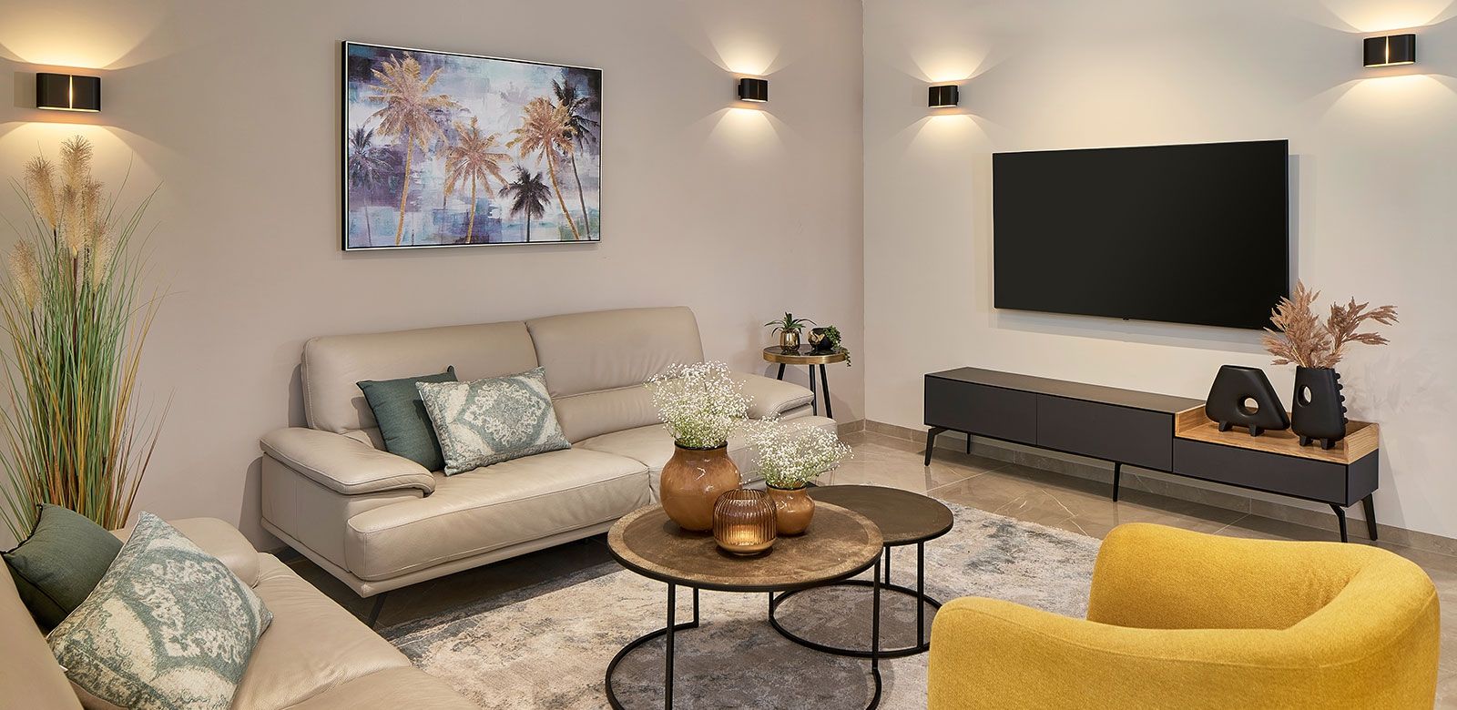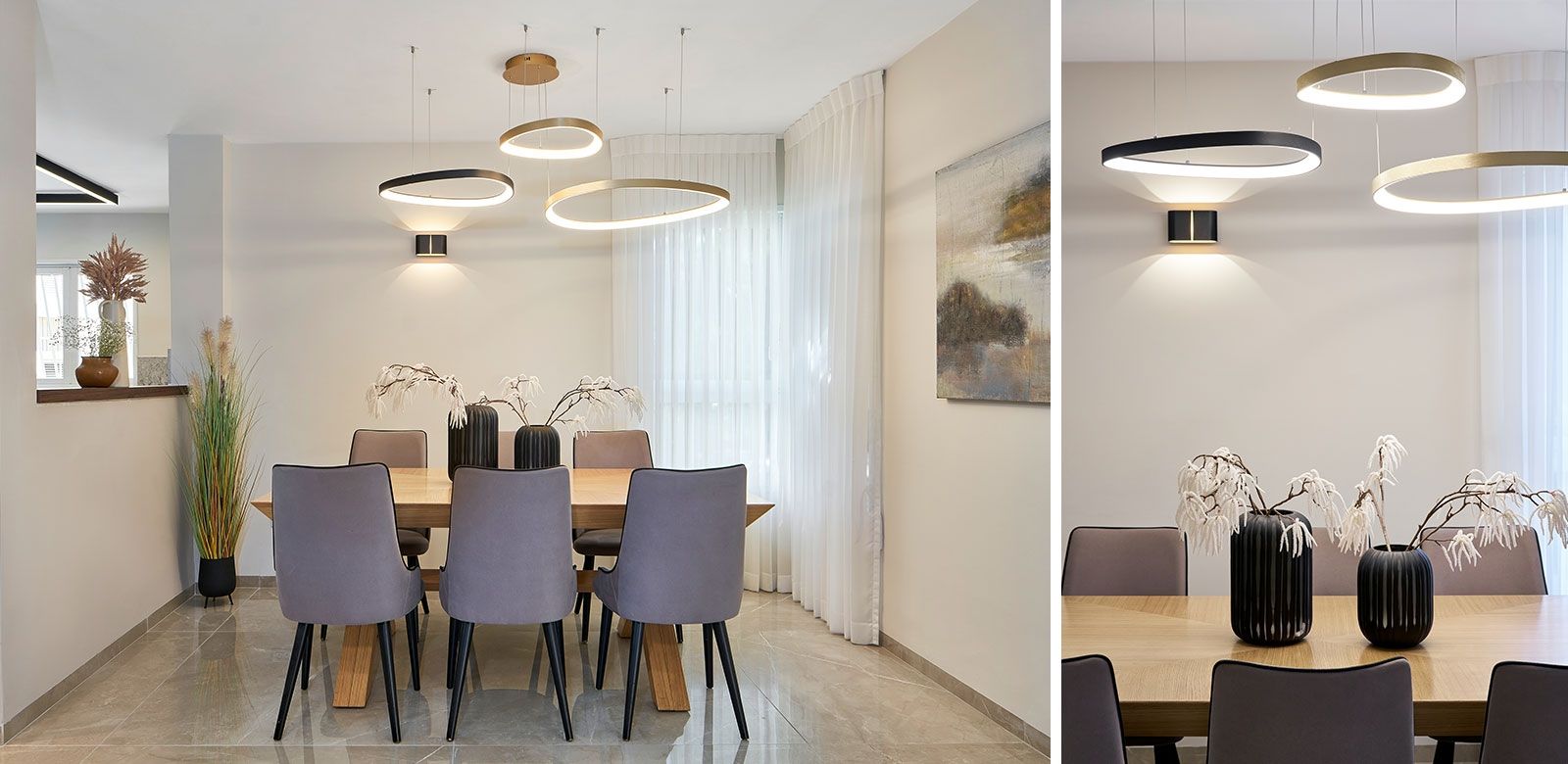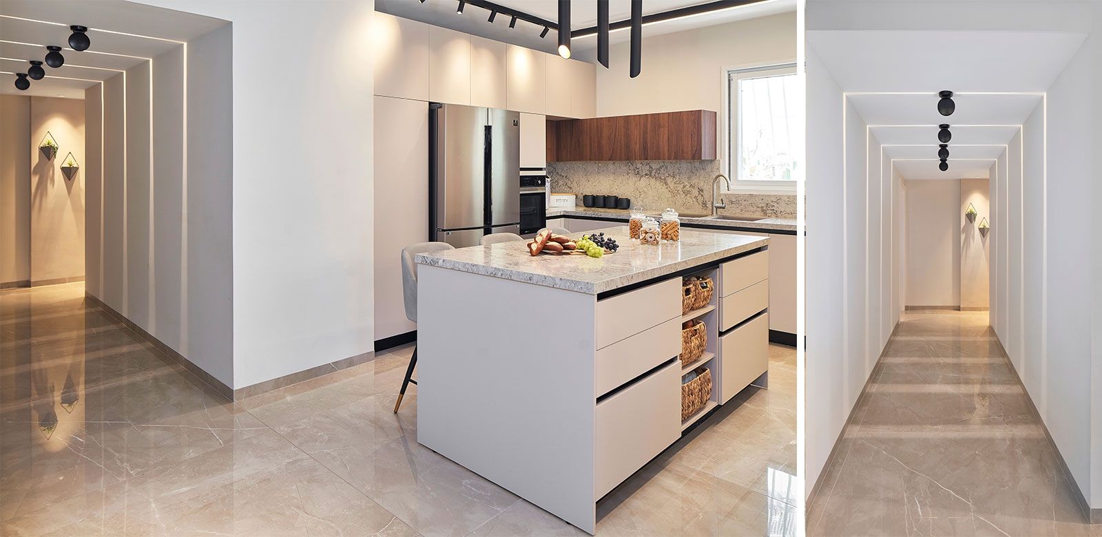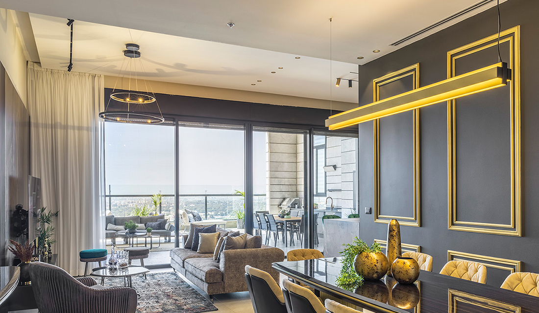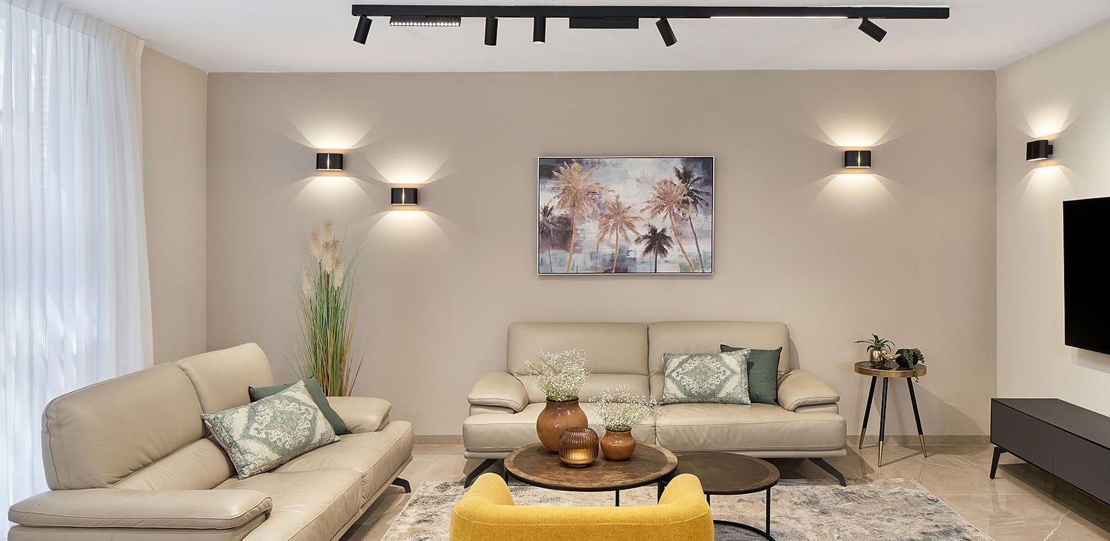 וכדי לקבל אפקט מרשים בקירות, השתמשנו בגופי תאורה צמודי קיר