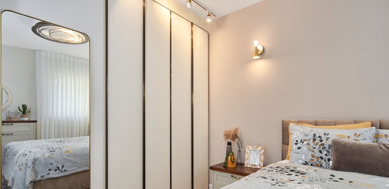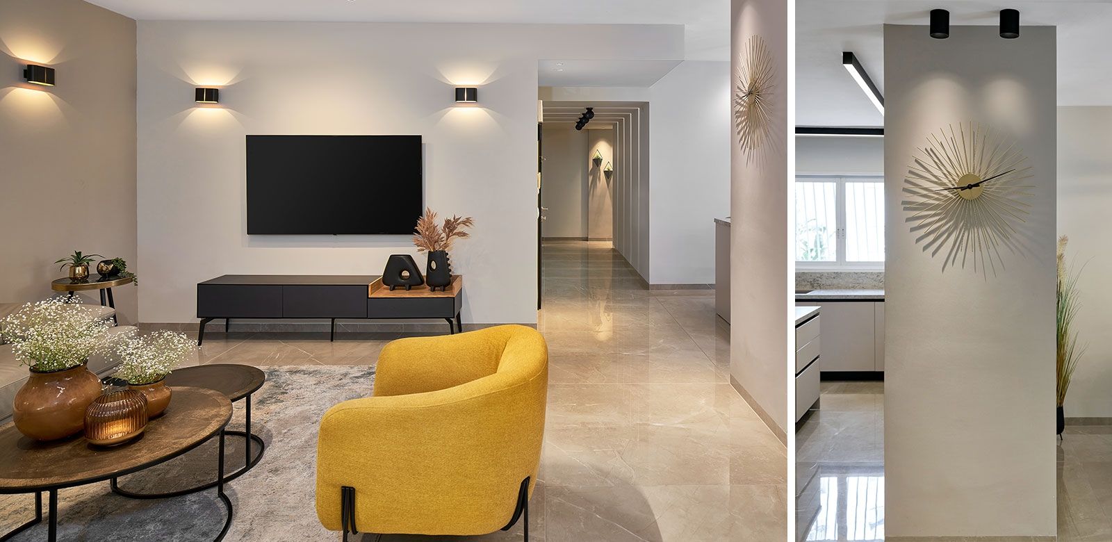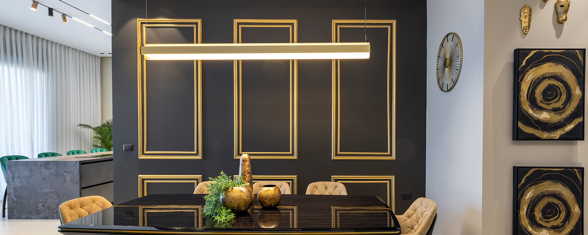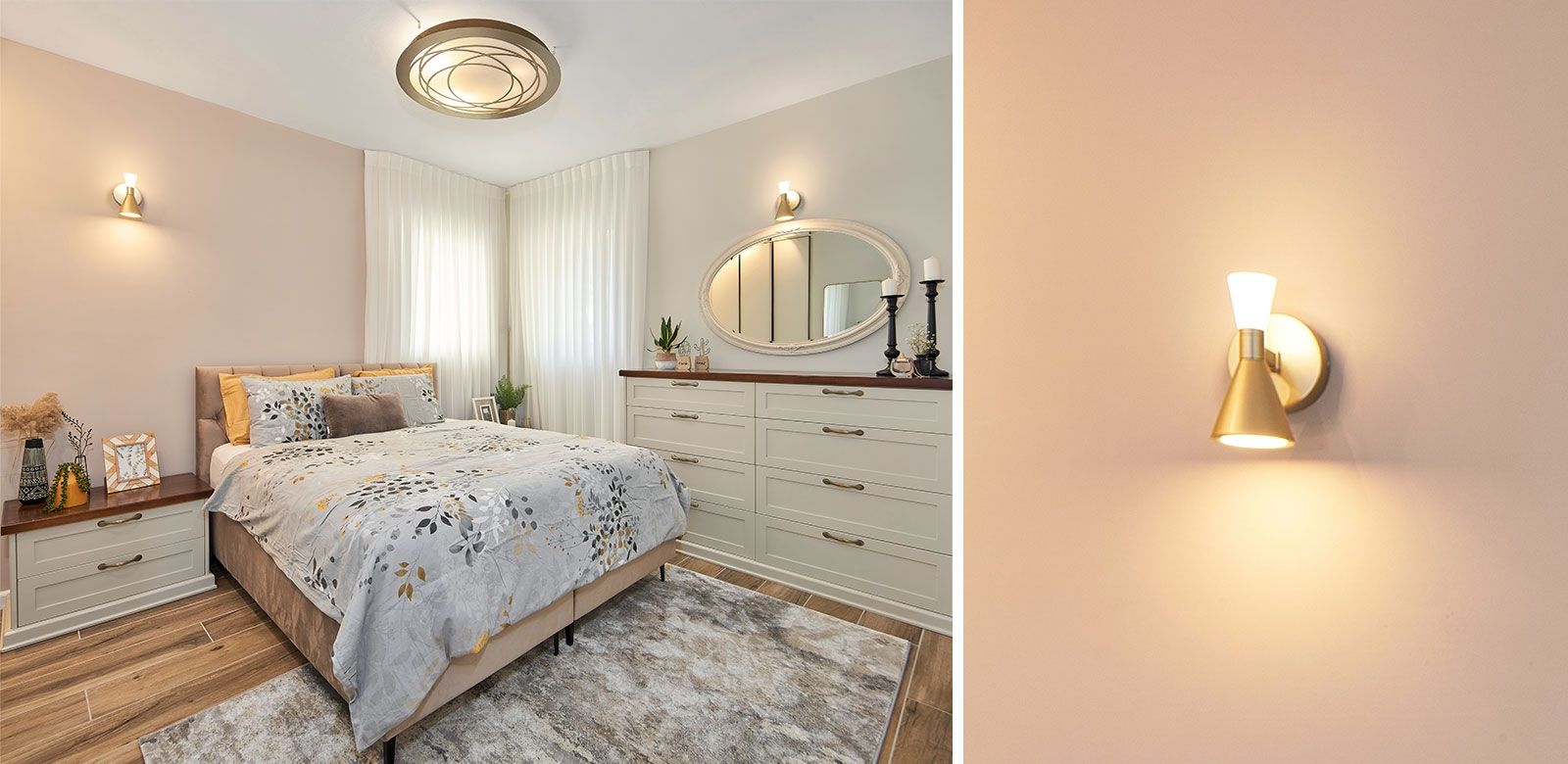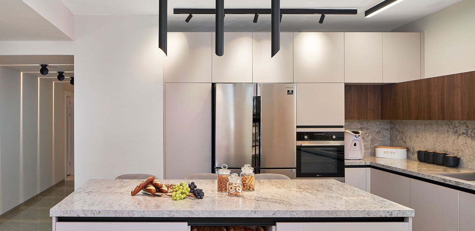 וכדי לקבל אפקט מרשים בקירות, השתמשנו בגופי תאורה צמודי קיר
