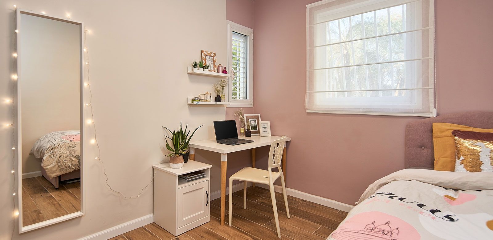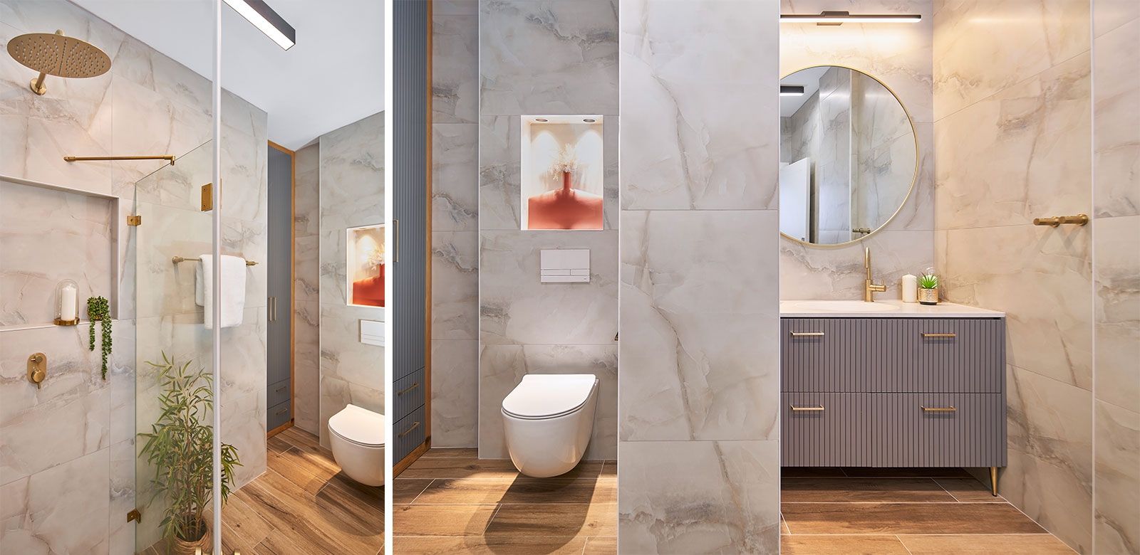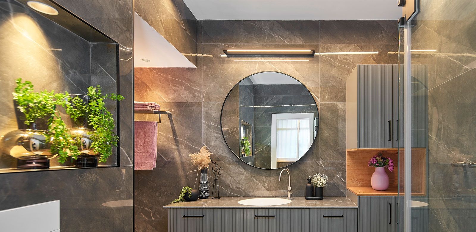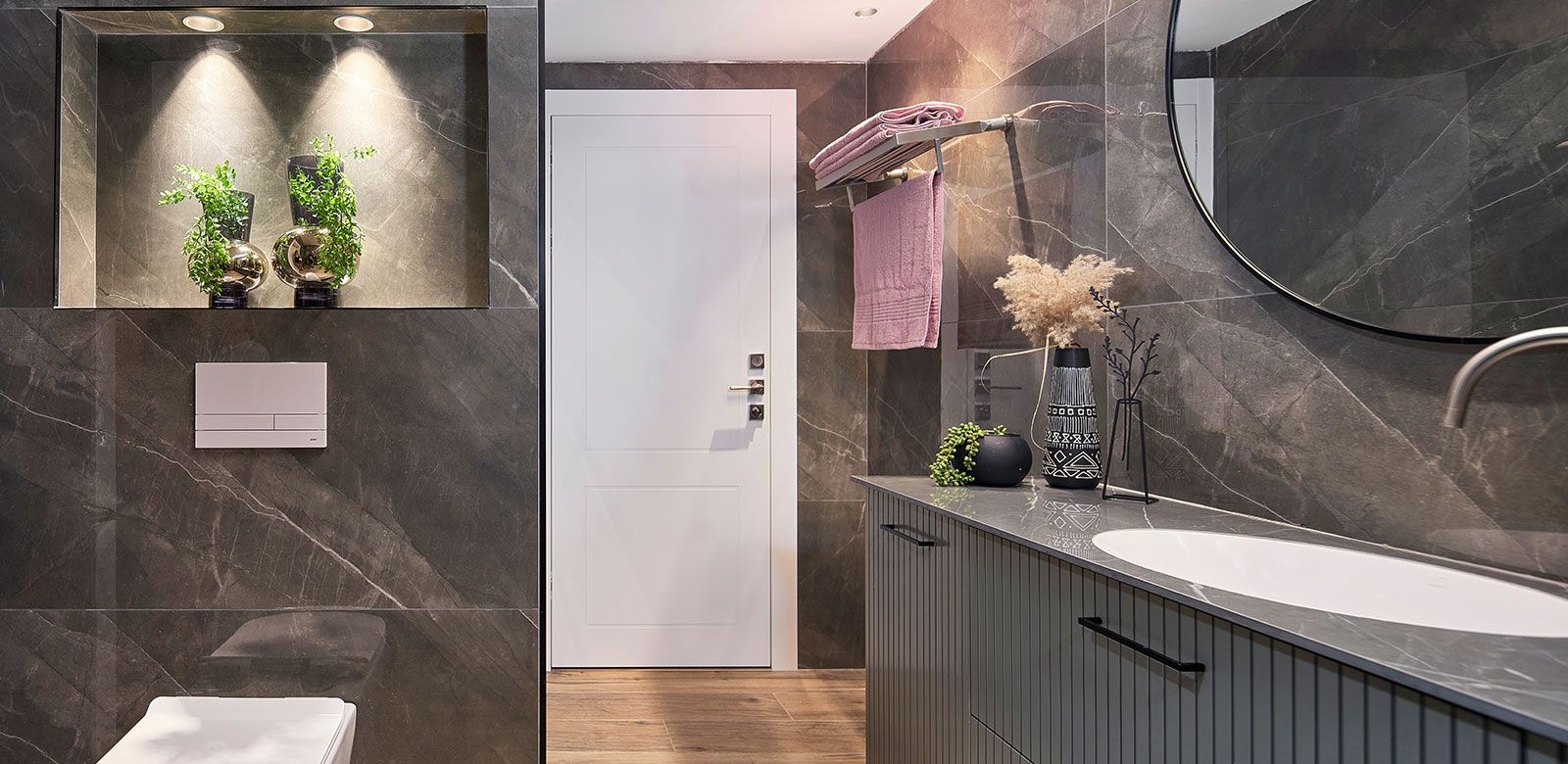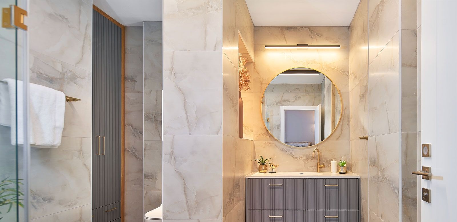 וכדי לקבל אפקט מרשים בקירות, השתמשנו בגופי תאורה צמודי קיר