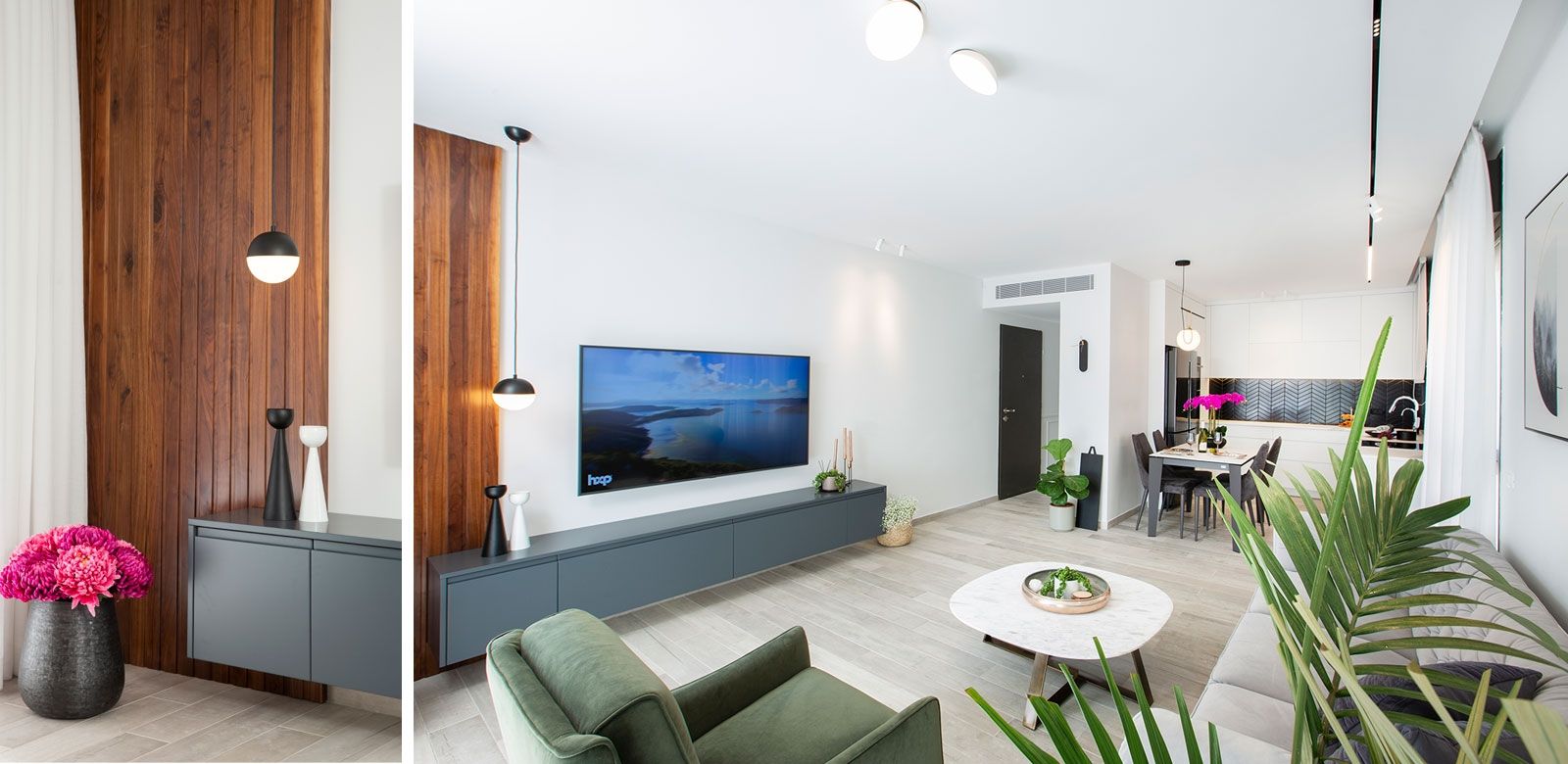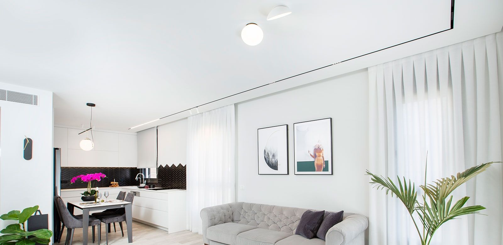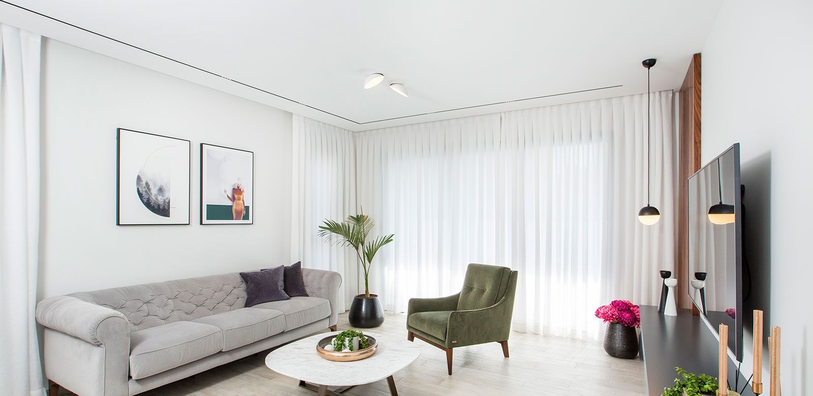 בסלון נבחר פס תאורה מגנטי היקפי לכל האורך שיצר מסגרת עדינה ואסתטית.