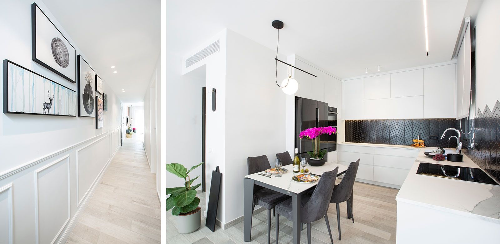 תאורת הפס המגנטי מתחלפת ויוצרת תאורת אווירה. שולבו גם גופי תאורה תלויים וצמודים דקורטיביים בקו נקי.