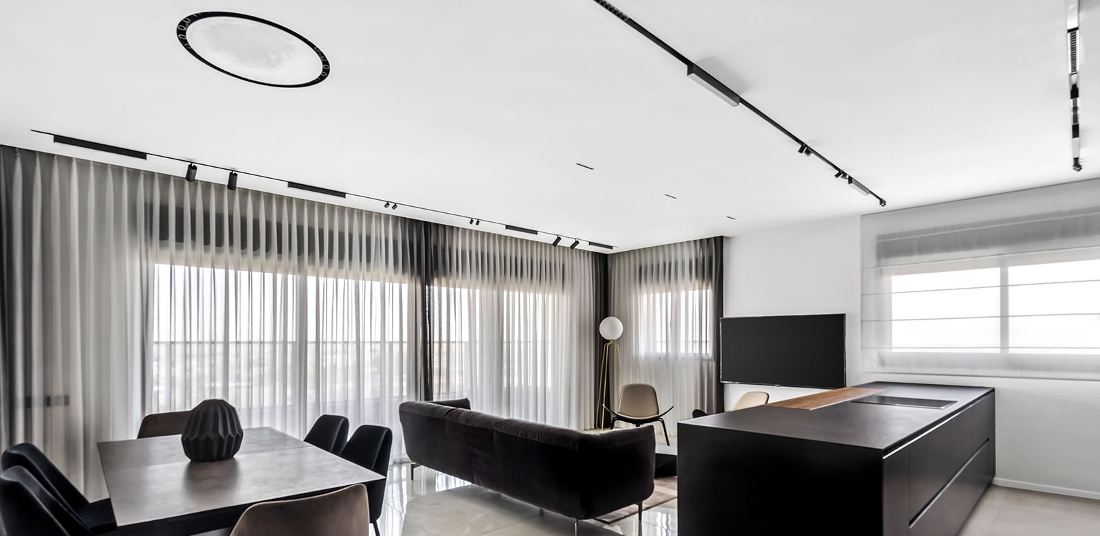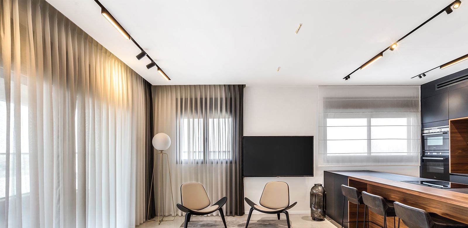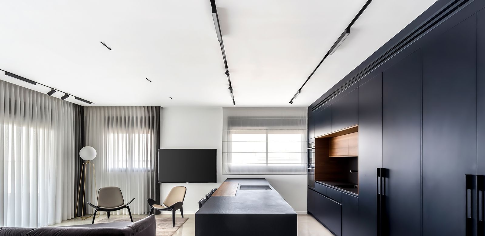 בחרתי בגופי תאורה בקווים נקיים שידגישו את הקו העיצובי הנקי והמעודכן וירגישו את האלמנטים העיצובים החשובים בדירה.