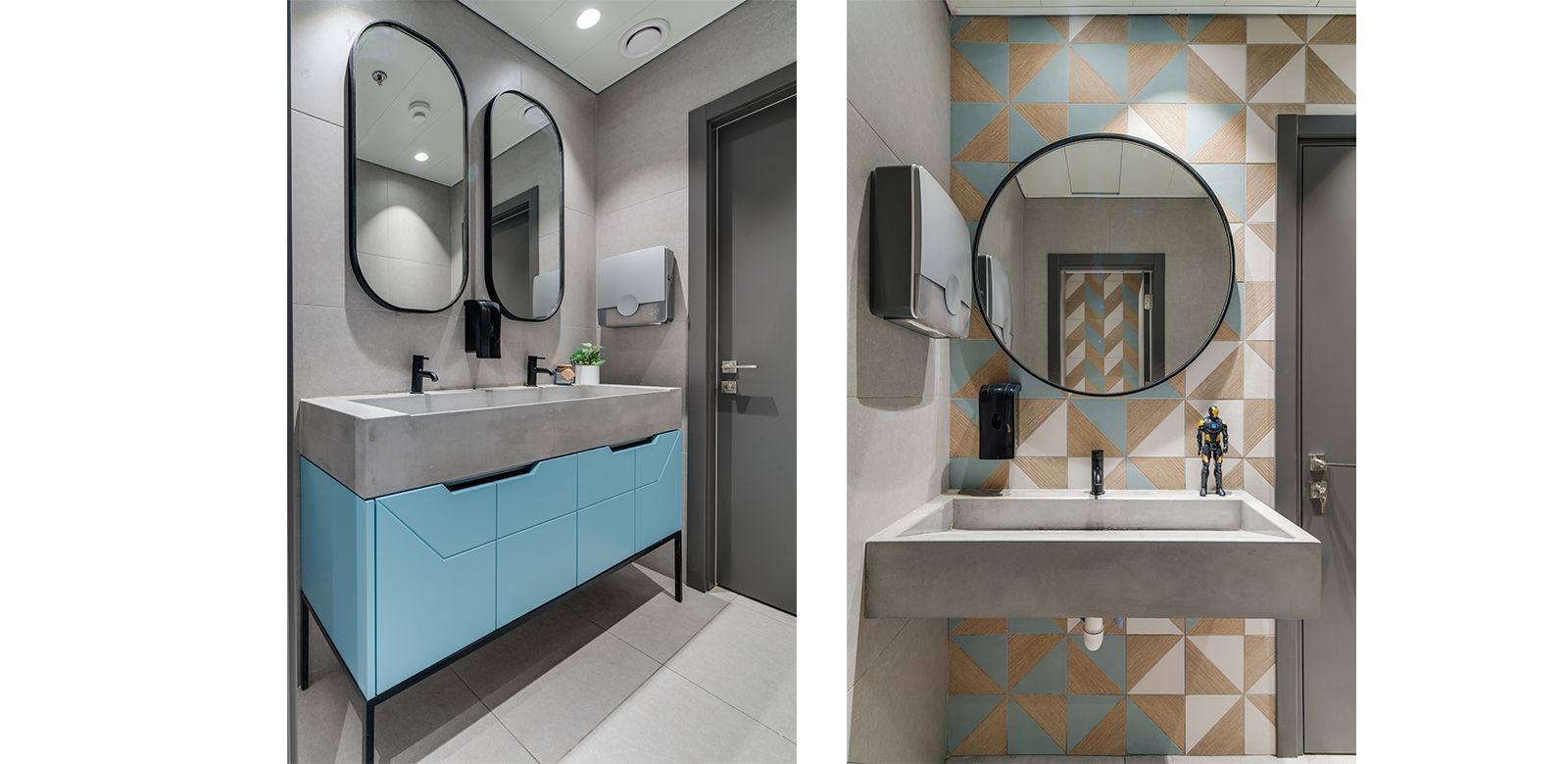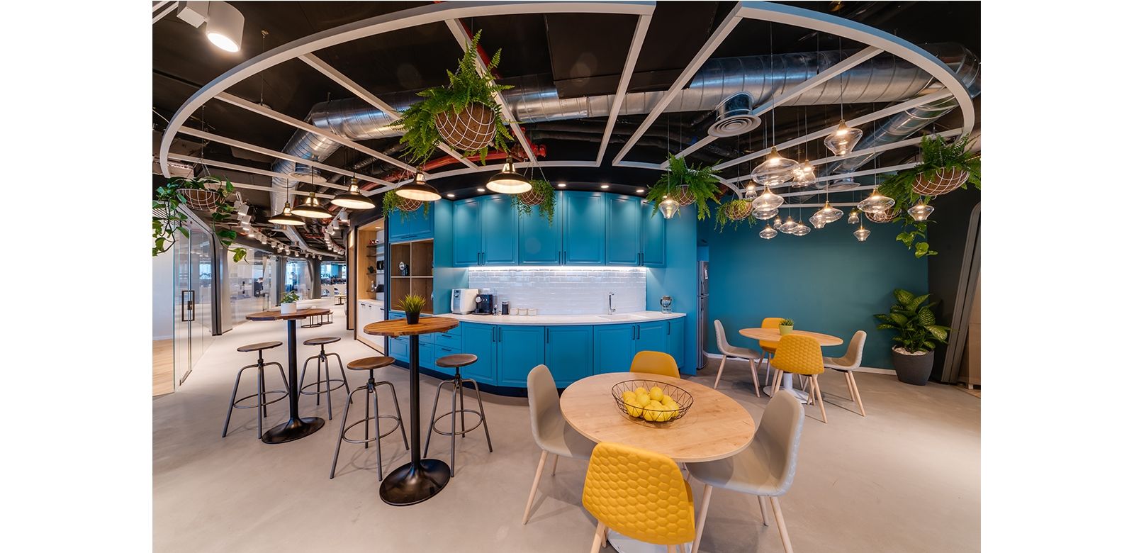 במקביל, היה חשוב לשמור על אווירה חמה ונעימה לעובדים במשרדים ולכן שולבו חומרים טבעיים- עץ, בטון, מתכת ובריקים. בחלל ההתכנסות של העובדים, סביב המטבח והבר נבחרו גופי תאורה אשר נותנים תחושה ביתית וחמה יותר יחד עם צמחיה תלויה וגוונים רכים.