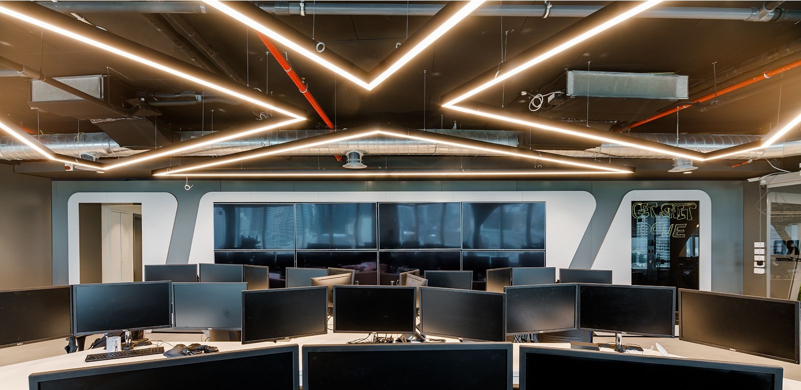 גוף תאורה מרכזי ובולט אשר יוצר במיוחד לטובת הפרויקט (ניתן לראות את הסקיצה הרעיונית של גוף התאורה) ומורכב מארבע צורות גיאומטריות המיוצרות מ-45 מטרים של פרופיל תאורה תלוי, המרחף בחלל העבודה הפתוח, יוצר אווירה "חללית" ומדגיש את הקונספט העיצובי. בתוך המשרדים האישיים מוקמו פרופילי תאורה שתולים היוצרים קווי אור משני צידי החלל.