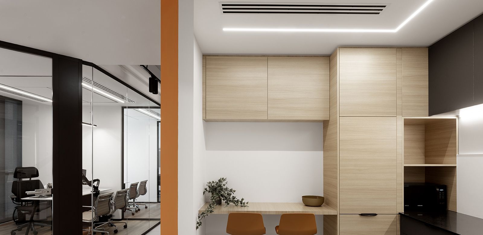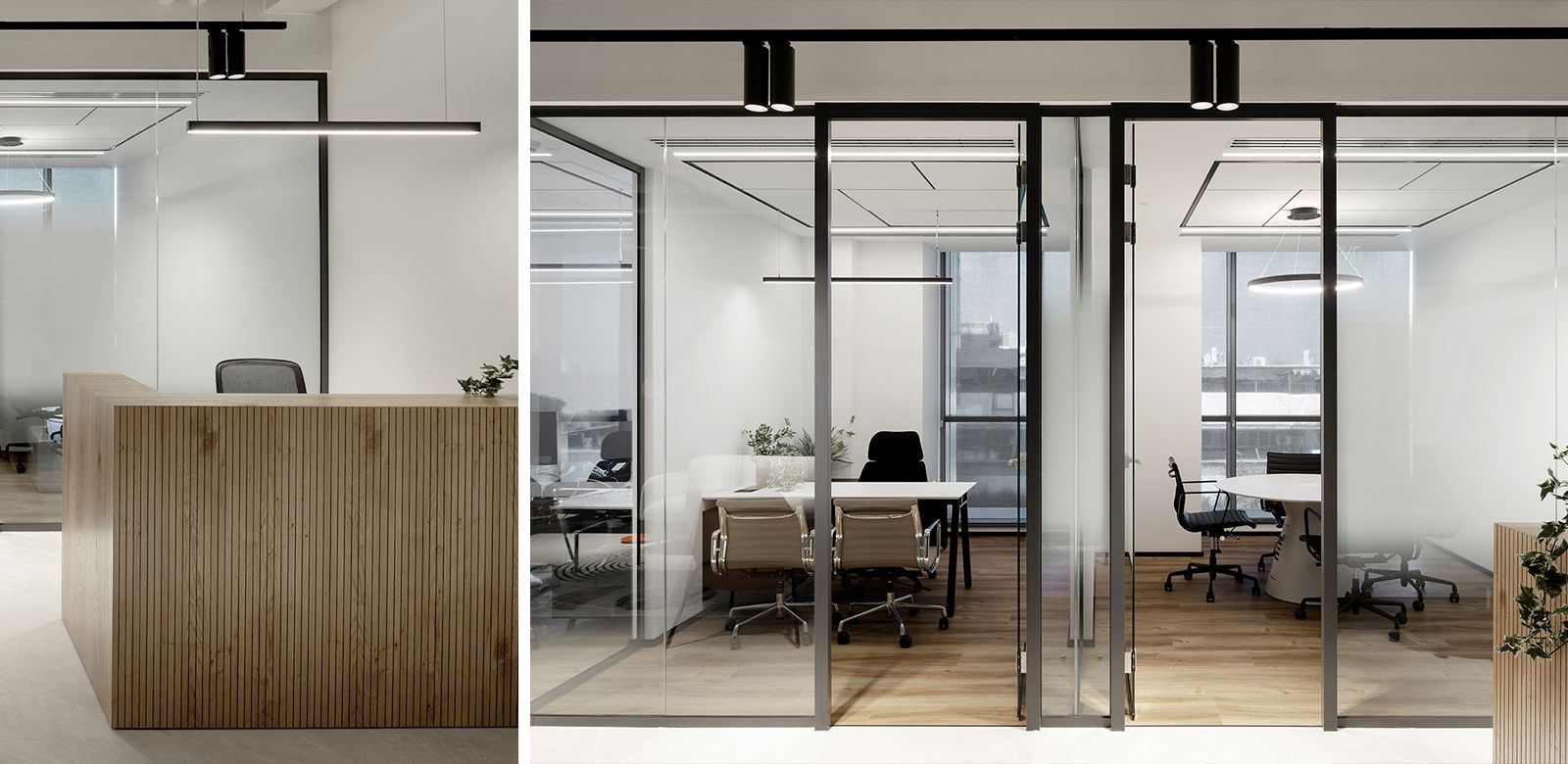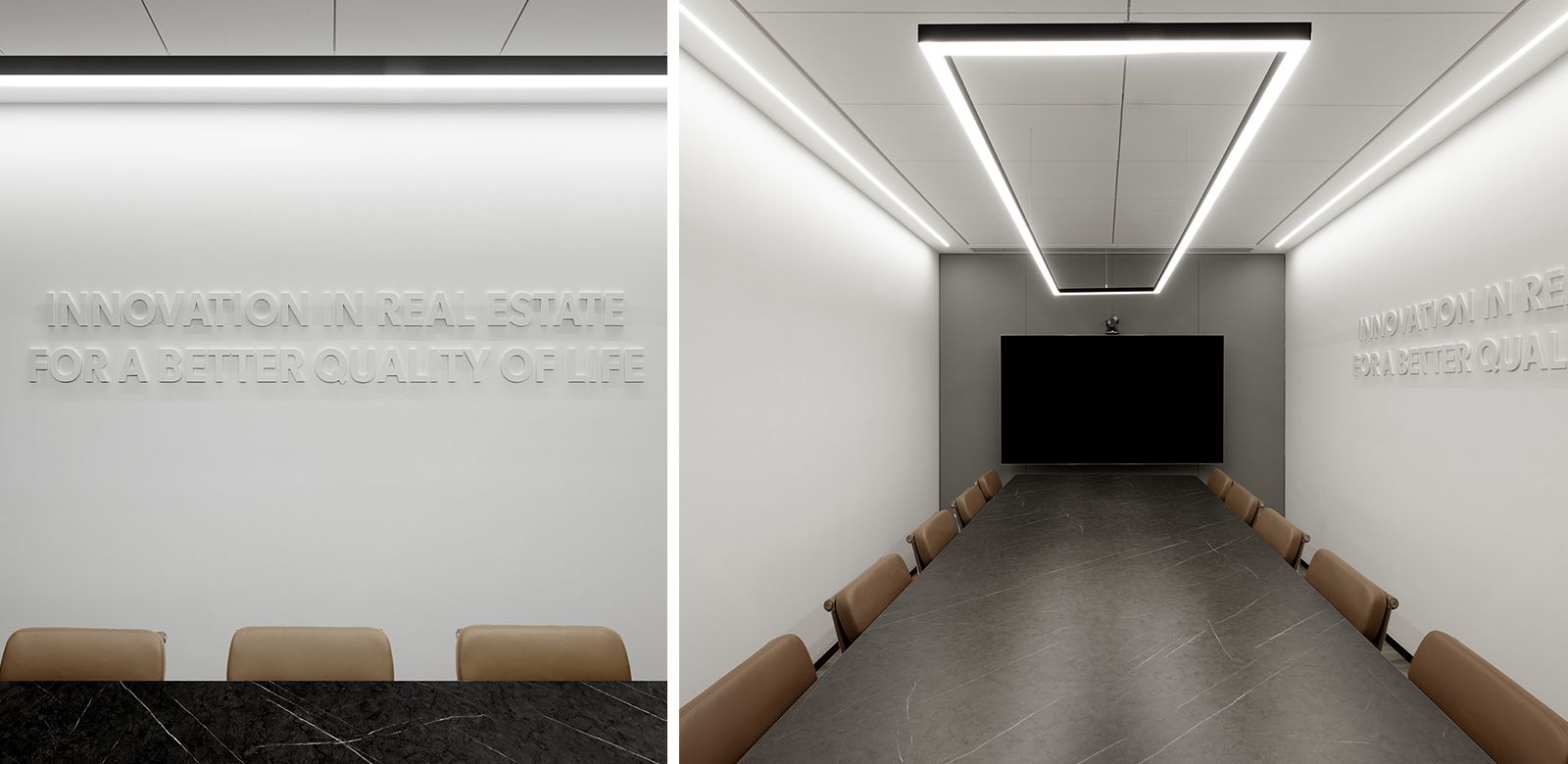 פרופילים ושקועים טכניים מינימליסטים להארת חדרי הישיבות ותאורה כללית.