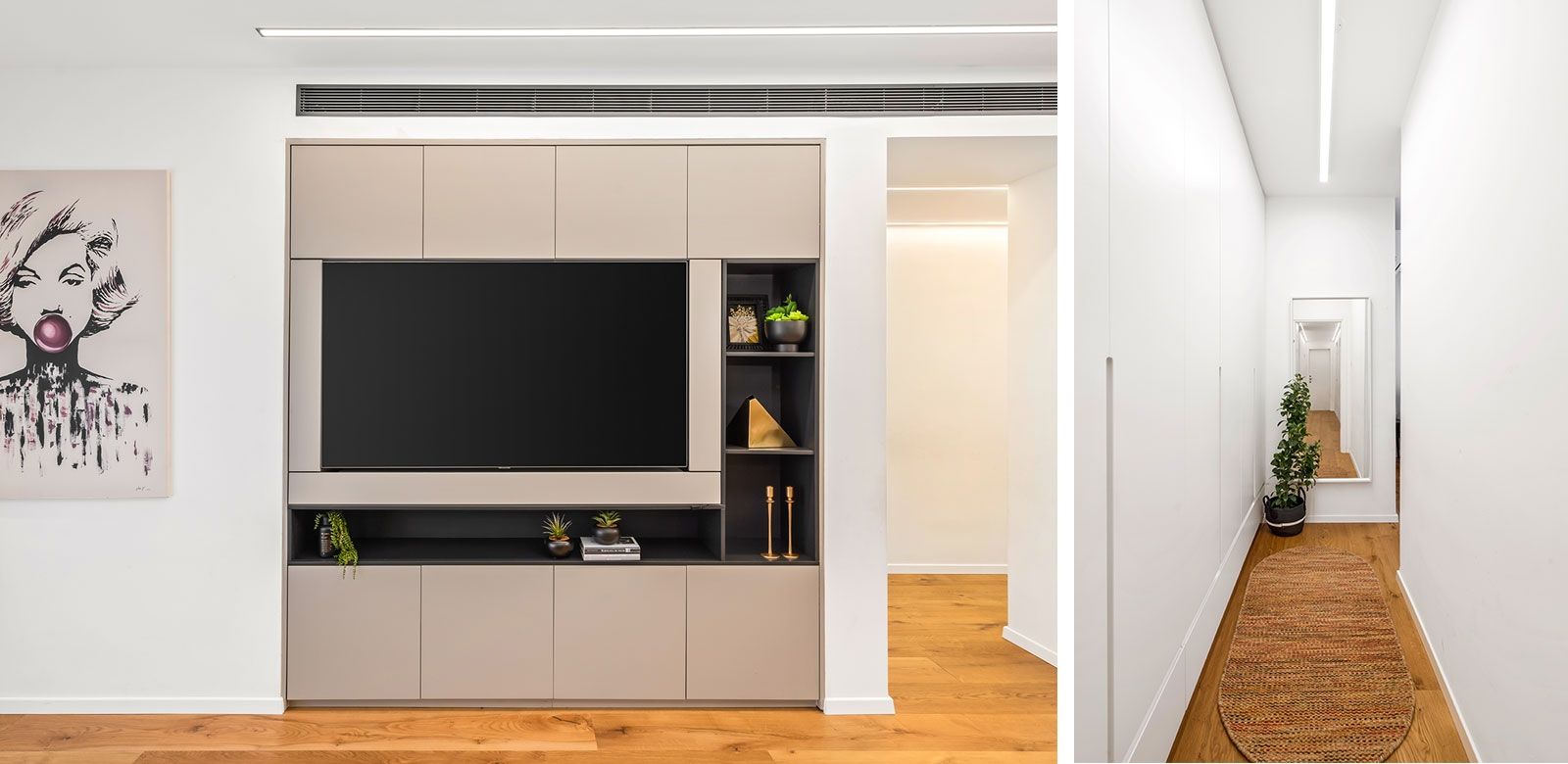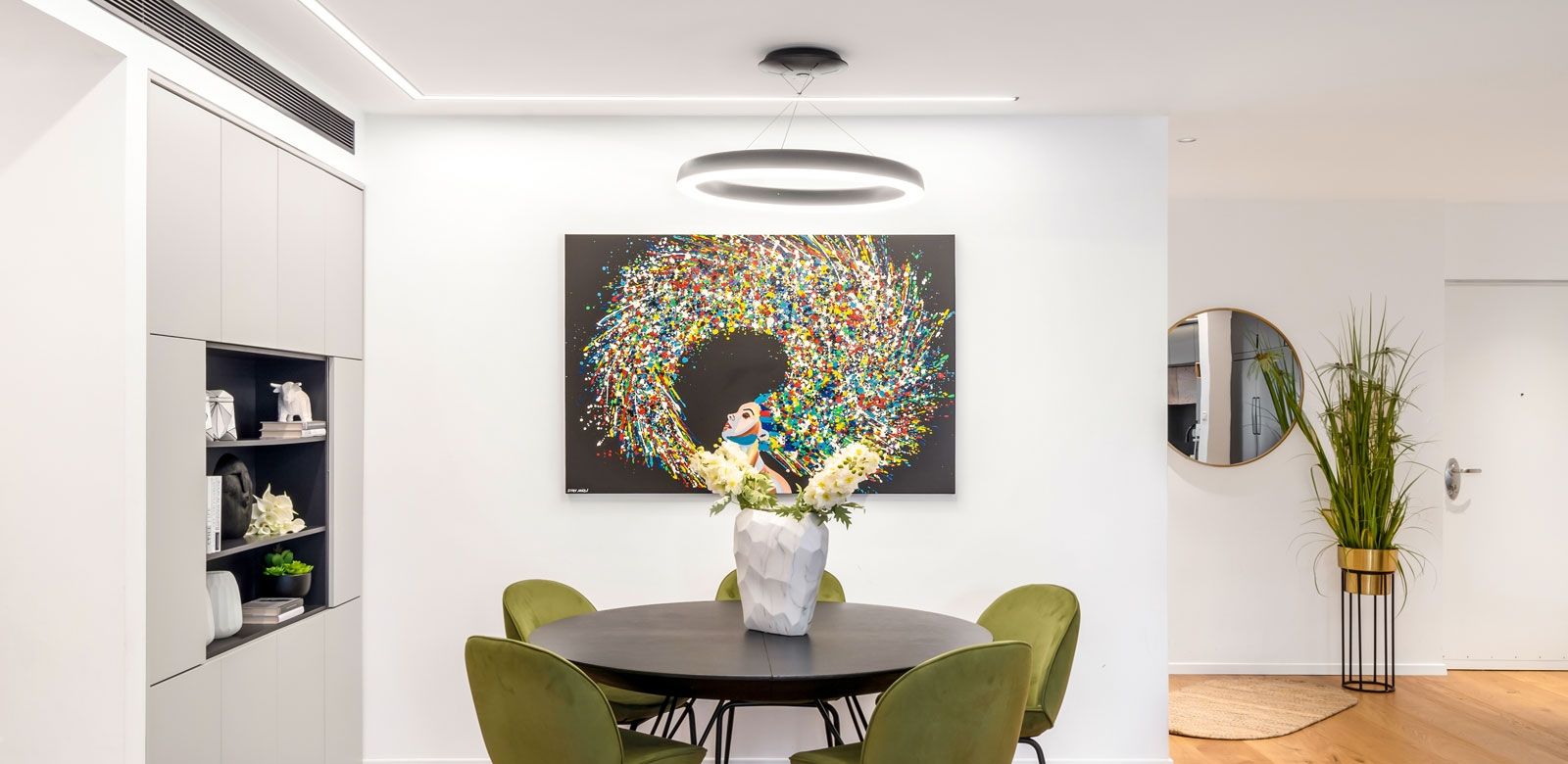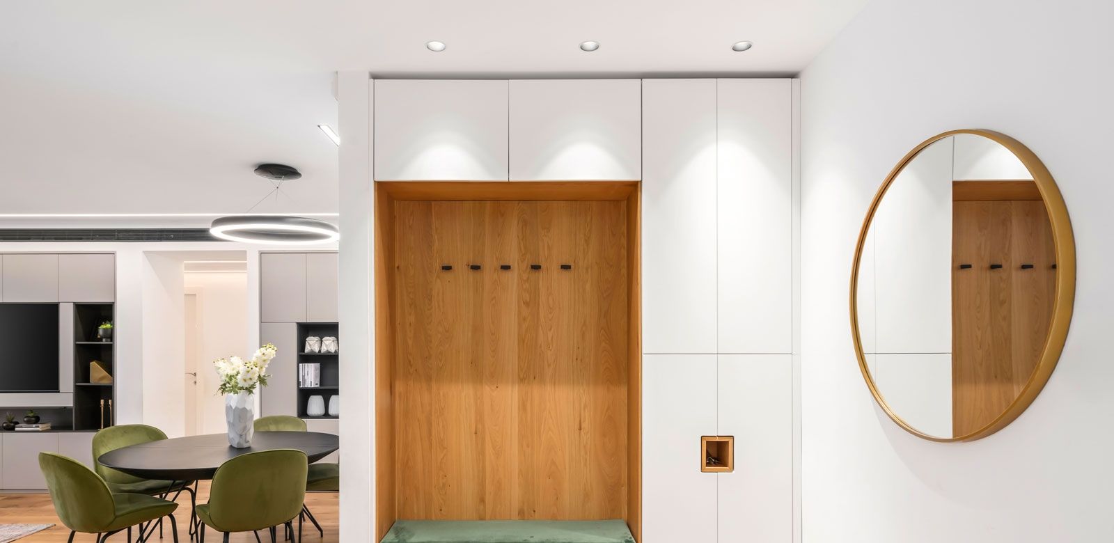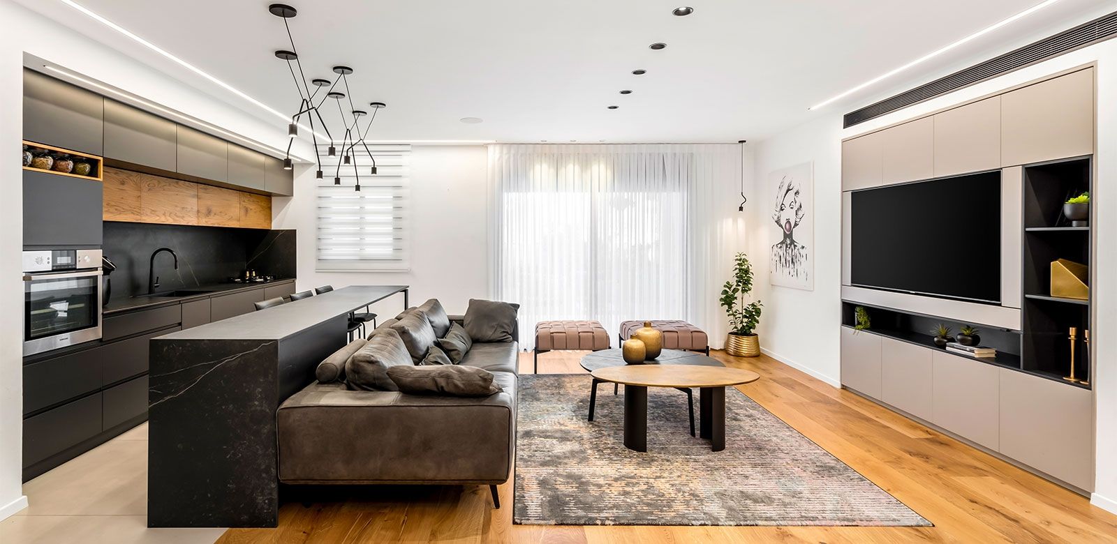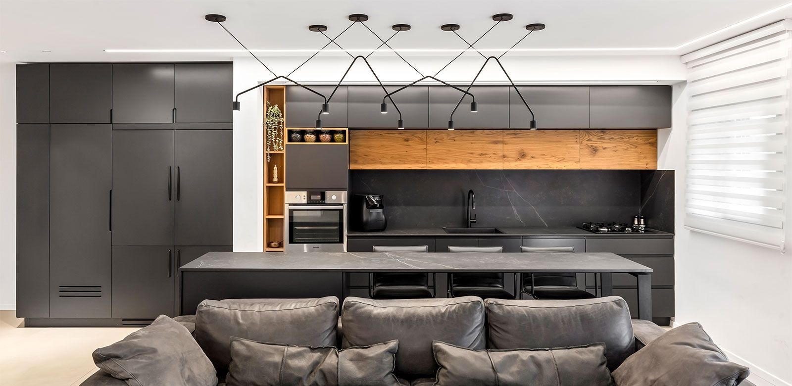 התאורה יוצרת עלומה יפה בחלל, משלימה ומדגישה אלמנטים עיצוביים.