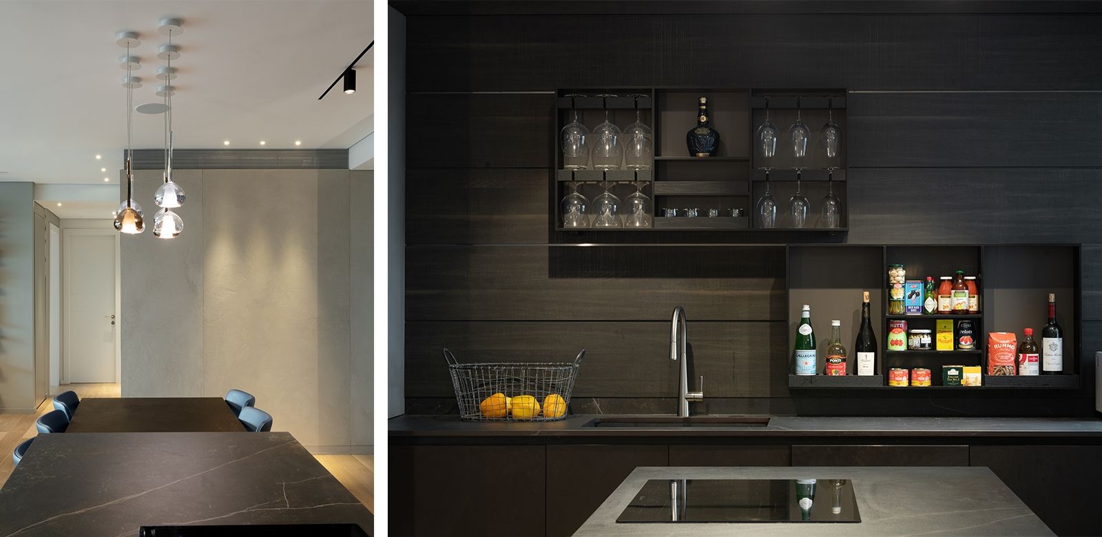 לאזורים רבים של הבית נבחרה תאורה "טכנית" שמאפשרת משחק אור מעניין ואווירה ייחודית, זאת באמצעות סוג האור המופק מגופי התאורה. להשלמת הקו העיצובי נבחרו גופי תאורה נוספים ייחודיים ואלגנטיים.