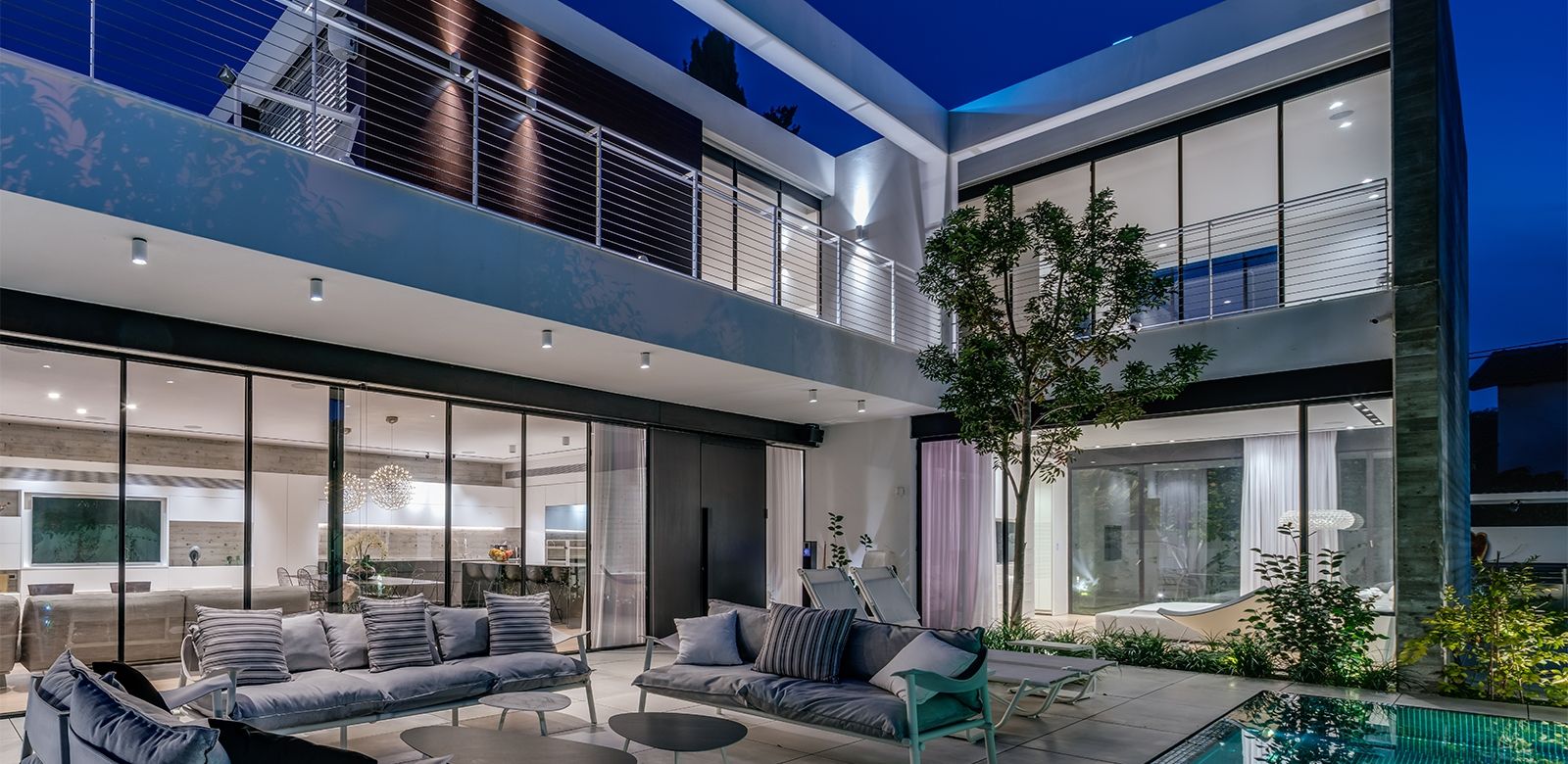 כבר מרגע הכניסה למתחם אנו נחשפים מיידית לגינה המרכזית של הבית כחלק מחוויית הפנים חוץ ששורה במקום.